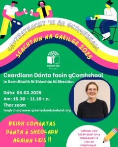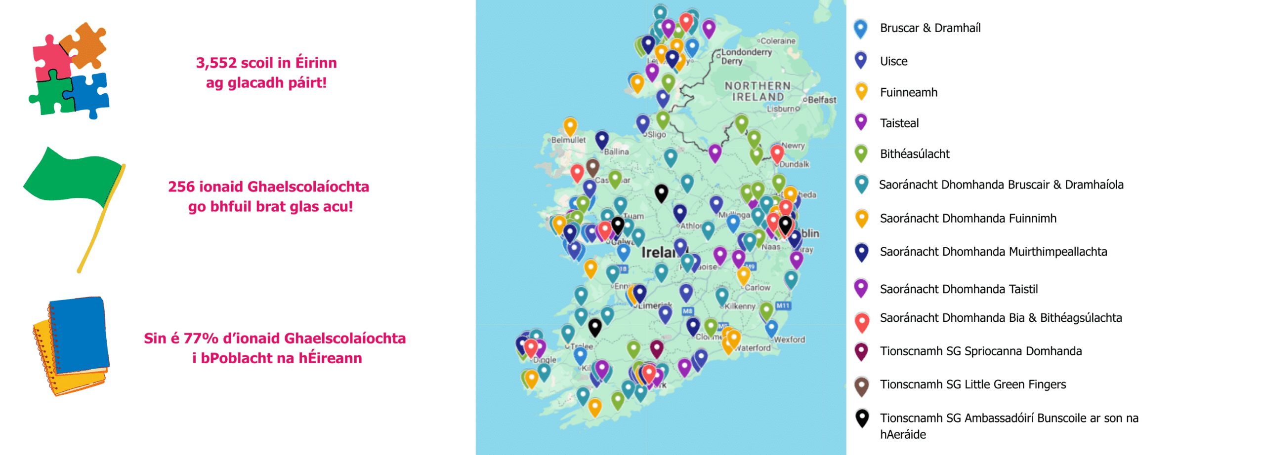 Tá 256 ionaid gaelscolaíochta cláraithe le Clár na Scoileanna Glasa agus sin é 77% d’ionaid ghaelscolaíochta i bPoblacht na hÉireann (tá córas Ecoschools i bhfeidhm i dTuaisceart na hÉireann). Tá méid mór acmhainní Gaeilge foilsithe againn i mbliana ina dteannta sin na lámhleabhair nuadeartha Gaeilge, a bheidh á sheoladh againn i mí Eanáir 2026. Tá na lámhleabhair fuinnimh agus muirí ar fáil anois!