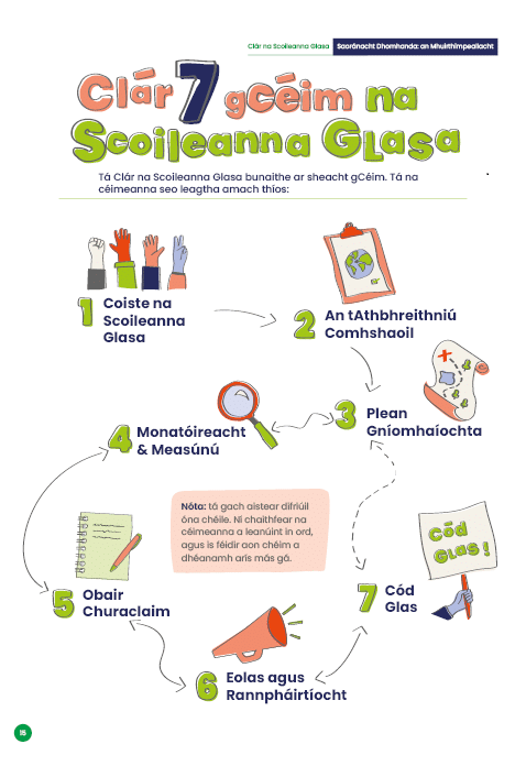 Tá Oifigeach Gaeilge againn a bhfuil ann chun cuidiú le hionaid ghaelscolaíochta agus Gaeltachta na tíre an clár Scoileanna Glasa a chur i bhfeidhm ar scoil.