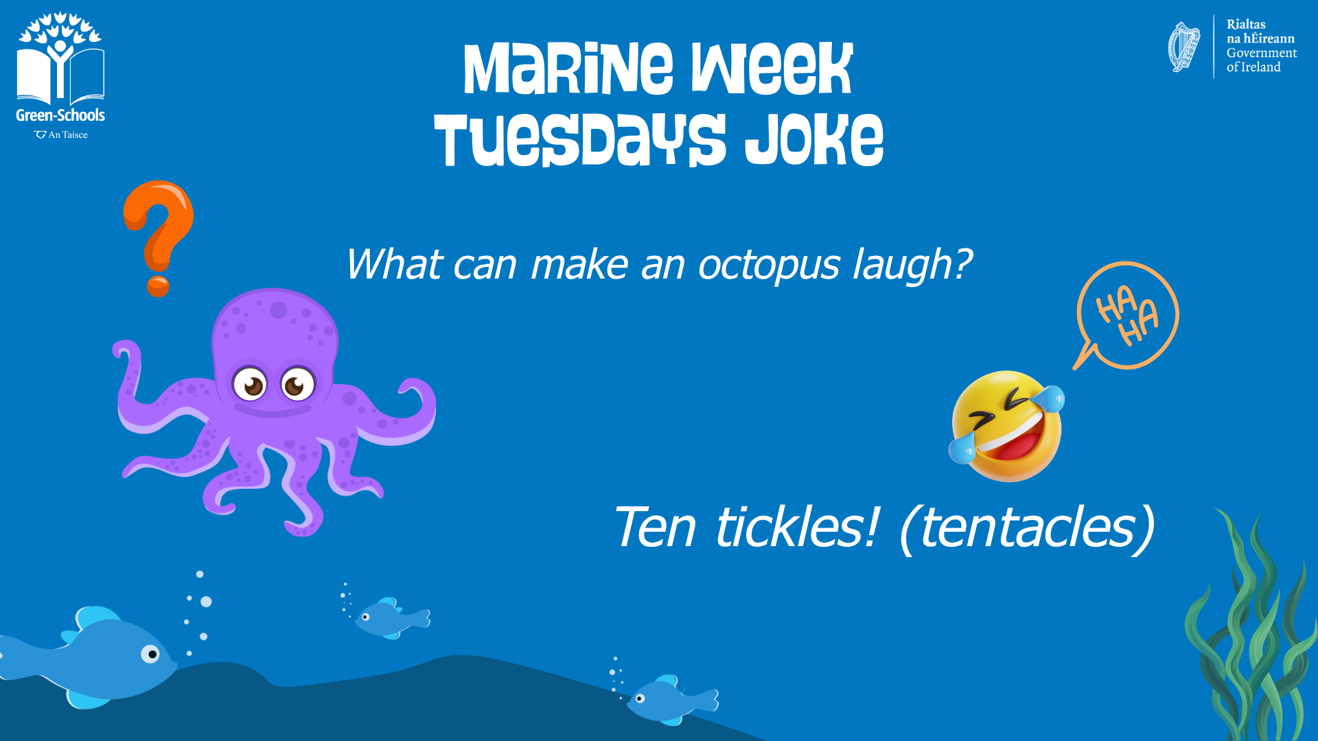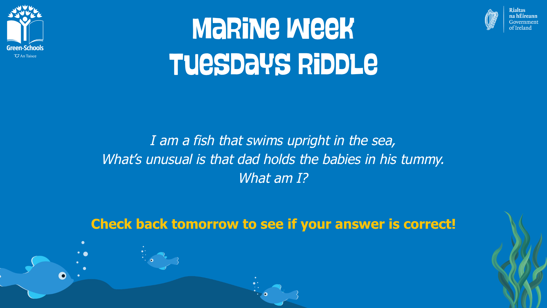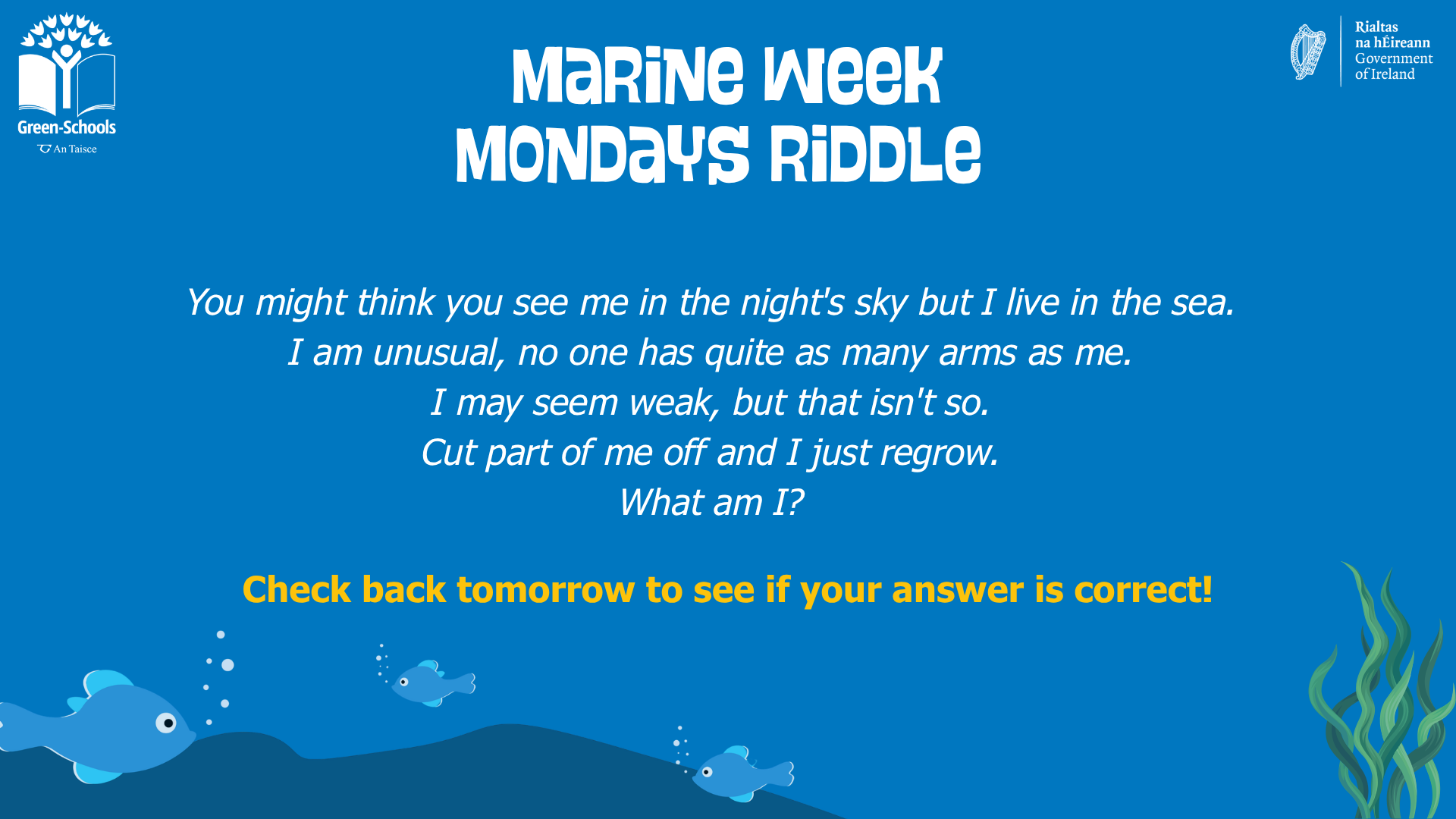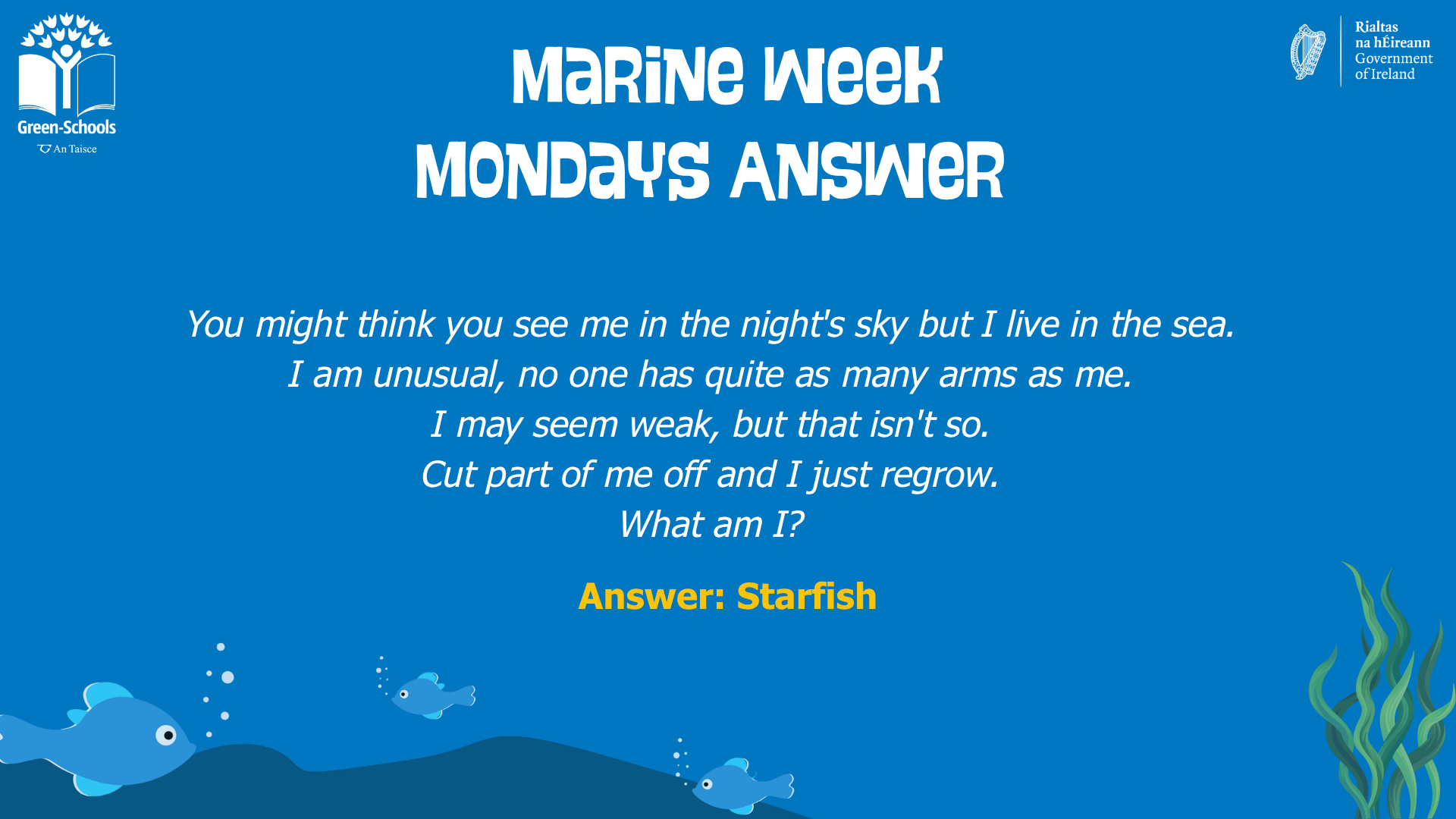 We will wrap things up with a special Marine Week Quiz to test what has been learned during the week! All this and lots more – join Green-Schools for a week of fun and learning.